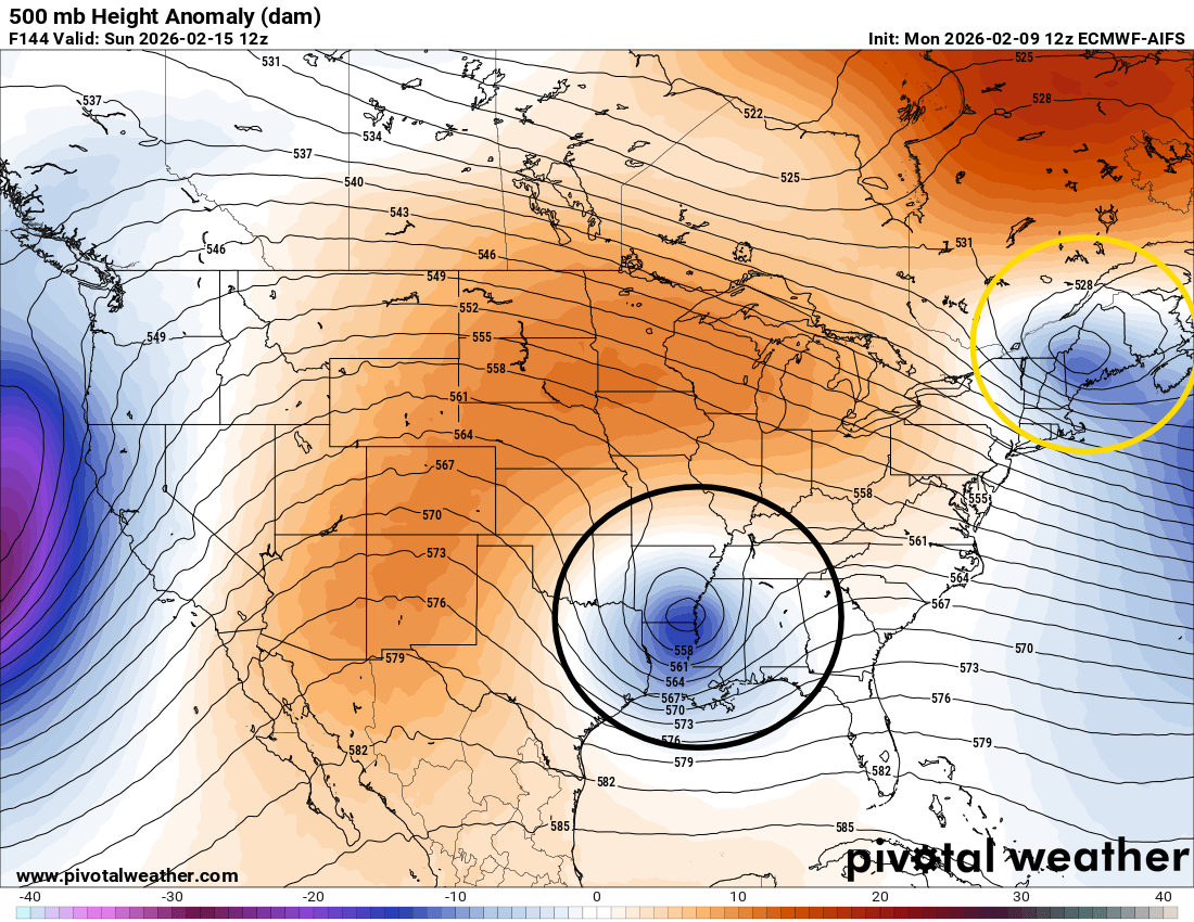 The potential flies in the ointment for the East are these two upper level disturbances I have circled above. The yellow one is a southeast moving disturbance that is kind of the last gasp of the polar trough of low pressure that has been plaguing the east for weeks, while the black circled one is the first piece of the new West Coast trough which will be undercutting the high pressure area over the central United States. Most of the models keep these two systems separate from each other — with the end results as far as sensible weather being a shot of snow and colder weather for the Northeast from that system and a swath of (needed) precipitation in the form of mainly rain for the Southeast quarter of the country.
