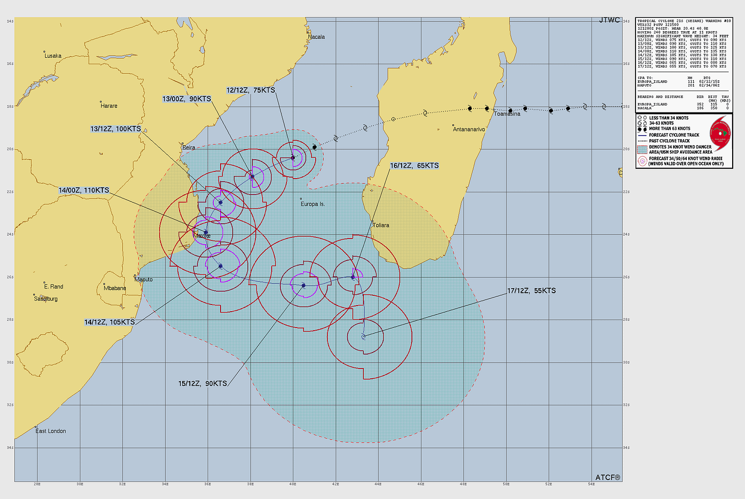 The Joint Typhoon Warning Center (JTWC) forecast shows the cyclone passing very close to the southern coast of Mozambique with maximum sustained winds of 110 knots (125 mph).