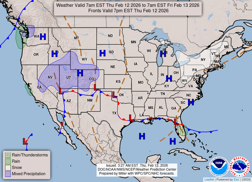 Taking a quick look at weather stateside, things are relatively quiet today, with some snow showers expected over the Northeast, and the upper level weather disturbance that brought rain and snow to California finally bringing some rain showers and higher elevation snows to the Intermountain West.