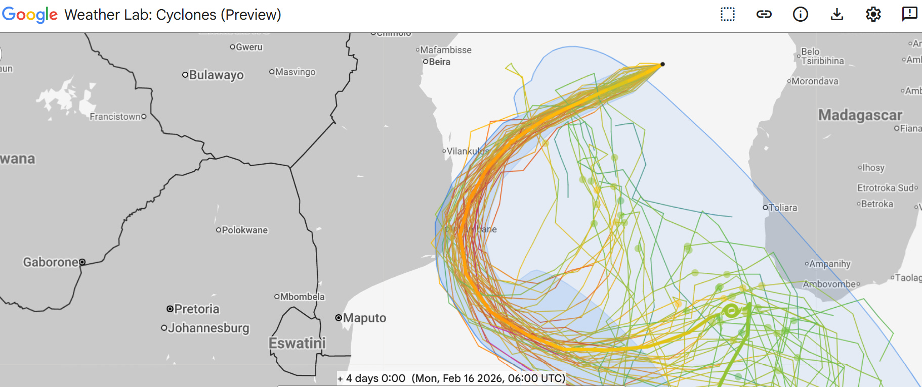 Gezani is in relatively weak steering flow to the north of a deep trough of upper level low pressure to the southeast of the southern tip of Africa. As such, its motion is likely to be relatively slow and erratic. The Google DeepMind AI ensemble (above) shows that the general motion of Gezani to the southwest with a turn to the southeast has decently high confidence — but whether or not the storm will actually make landfall in Mozambique near Inhambane or remain just offshore is uncertain. As an aside, my colleague Andrew Hazelton has a good blog post about the performance of the AI models with Gezani as it approached Madagascar.