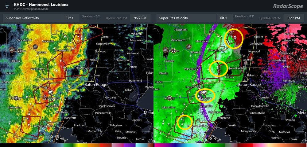 As I talked about in my post late Saturday evening, very small but intense areas of low pressure and rotation called mesovortices (yellow circles on the Doppler velocity/wind image above) are the focus for meteorologists in QLCS events, as the mesovortices can produce tornadoes and enhanced straight line winds. A number of measured severe wind gusts (58+ mph) occurred with this QLCS — including a 73 mph gust at the Lake Charles NWS office when a mesovortex moved across. NWS Lake Charles also reported a 132 mph gust from a mesonet site in Acadia Parish, LA — a mesovortex also moved through this region, and it would seem possible that the site was actually impacted by a tornadic circulation.