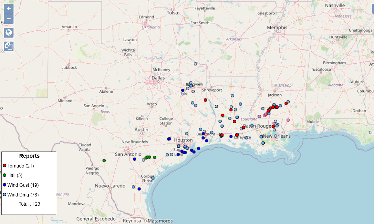 Starting off today with a recap of the severe weather over the weekend. Saturday afternoon and night ended up being the busiest period for severe weather, with over 100 reports of wind damage and tornadoes from southeast Texas across southern Mississippi. A few reports of marginally severe hail occurred as the initial storms were developing over south central Texas Saturday afternoon.