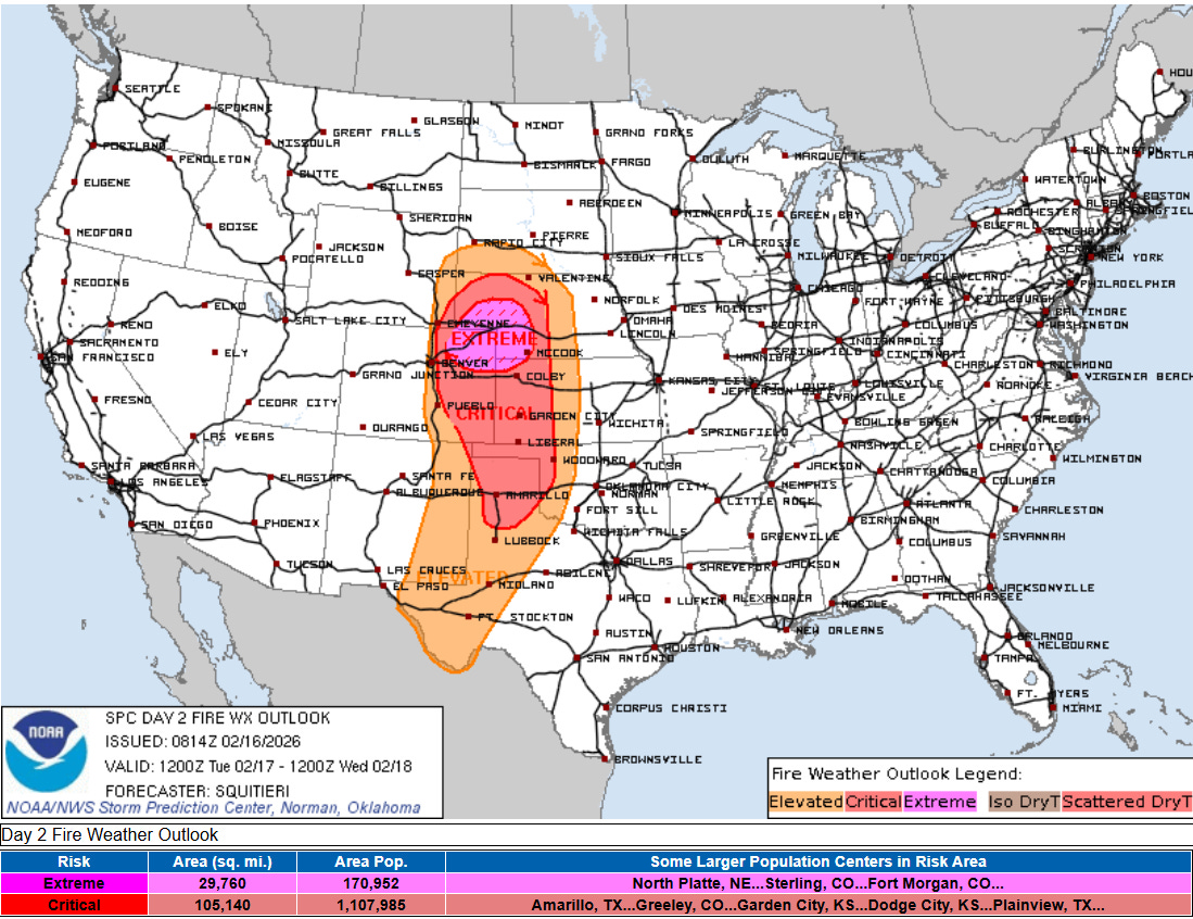 Another serious hazard that will evolve as this storm system shifts east is a significant risk of wildfires in the precipitation starved Plains region. The NWS Storm Prediction Center has issued a relatively rare extremely critical (level 3 of 3) fire weather conditions for northeast Colorado, northwest Kansas and southwest Nebraska, with much larger surrounding critical and elevated fire weather areas. Widespread wind gusts of 40 to 60 mph are expected across the Plains Tuesday afternoon with low relative humidity values — as low as less than 10% in the extremely critical region.