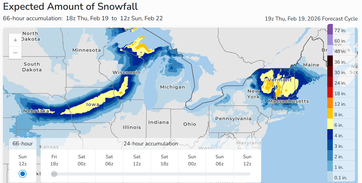 The same low pressure system is also producing a band of heavy snow to its northwest as shown in the NWS Weather Prediction Center snowfall forecast through Saturday morning. Moisture from Lake Superior will result in an expanding area of heavier snow in the Upper Peninsula of Michigan.