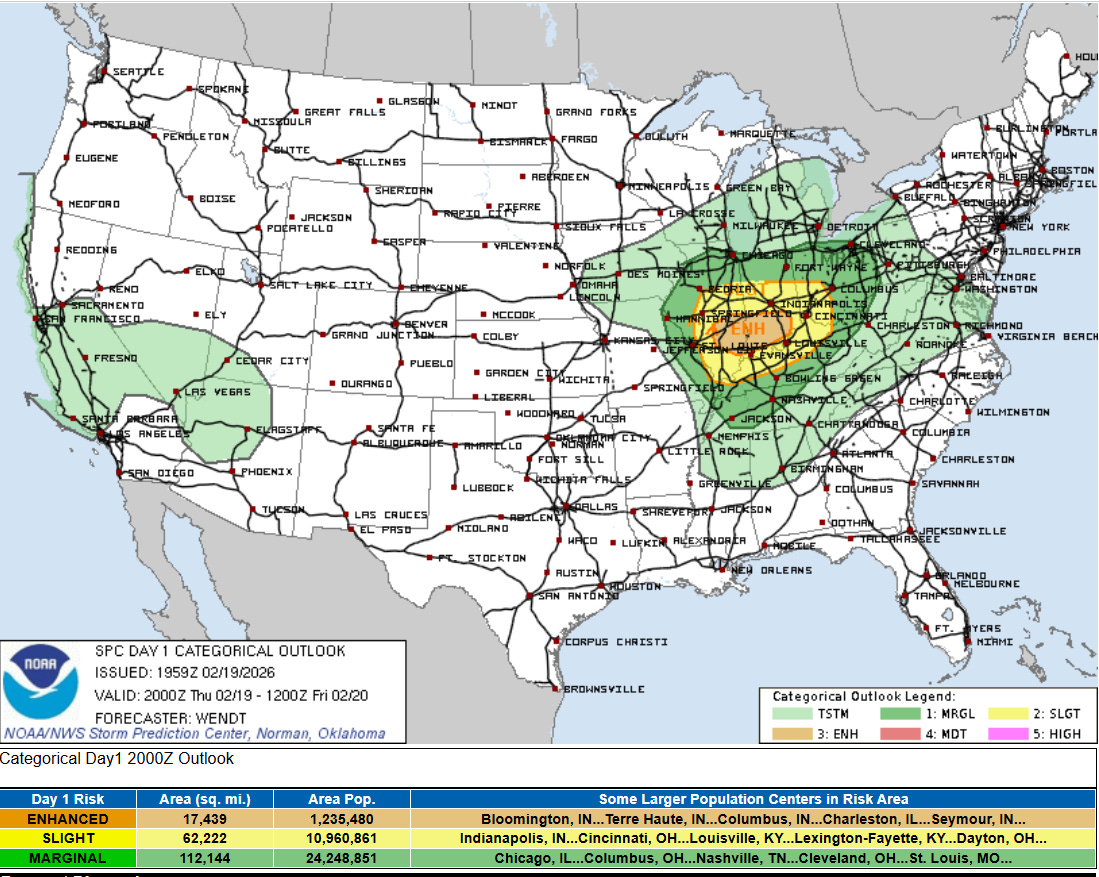 As an upper level disturbance swings into the Midwest and an associated surface low moves across northern Missouri toward northern Illinois, a favorable area for supercell severe thunderstorms is evolving across the lower Ohio Valley region. While the low level moisture will be a bit marginal, strong low level wind shear will be supportive for tornadoes with the most intense storms, and a few strong tornadoes are possible into tonight, particularly in the enhanced (level 3 of 5) risk area in the NWS Storm Prediction Center outlook.