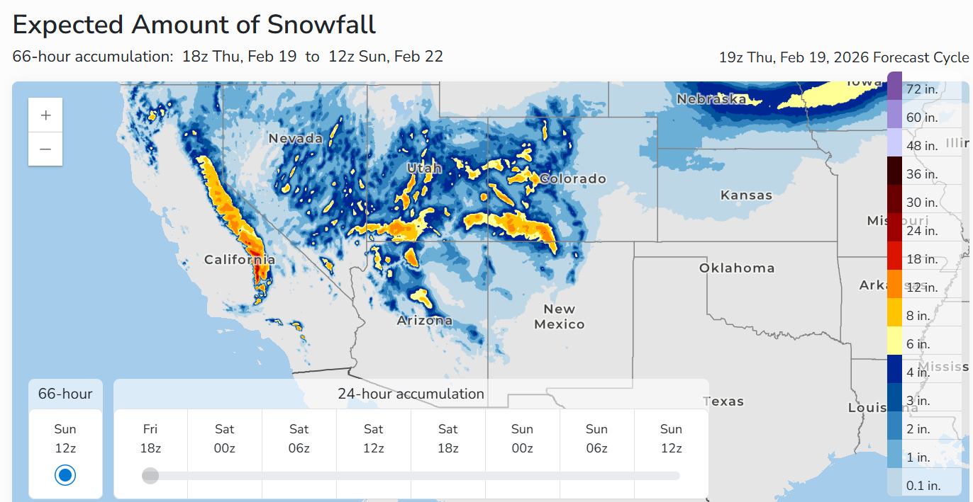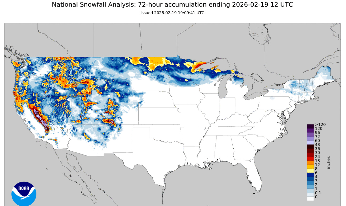 The National Operational Hydrologic Remote Sensing Center (NOHRSC) 72-hour snowfall analysis ending this morning shows that as expected heavy snow has been impacting the mountains of the Western US, but also as expected by far the heaviest snowfall has been in the Sierra Nevada, with amounts of more than 4 feet reported at some of the highest elevations.