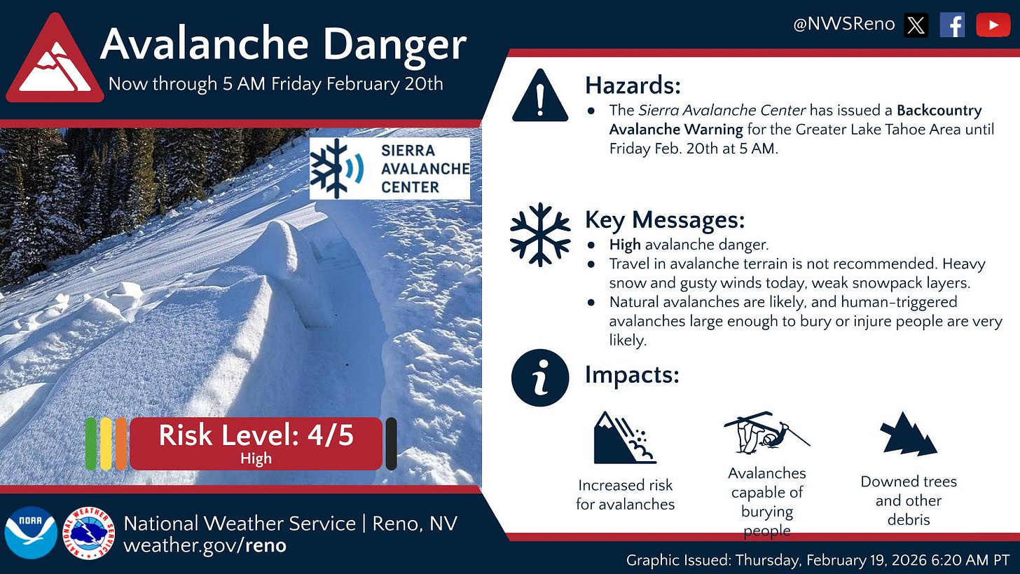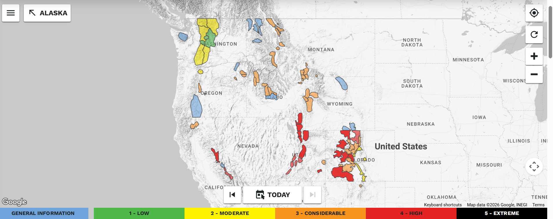 Per the US Forest Service avalanche danger levels on avalanche.org, this will keep high avalanche danger across the Sierra Nevada and higher elevations of Utah and western Colorado.
