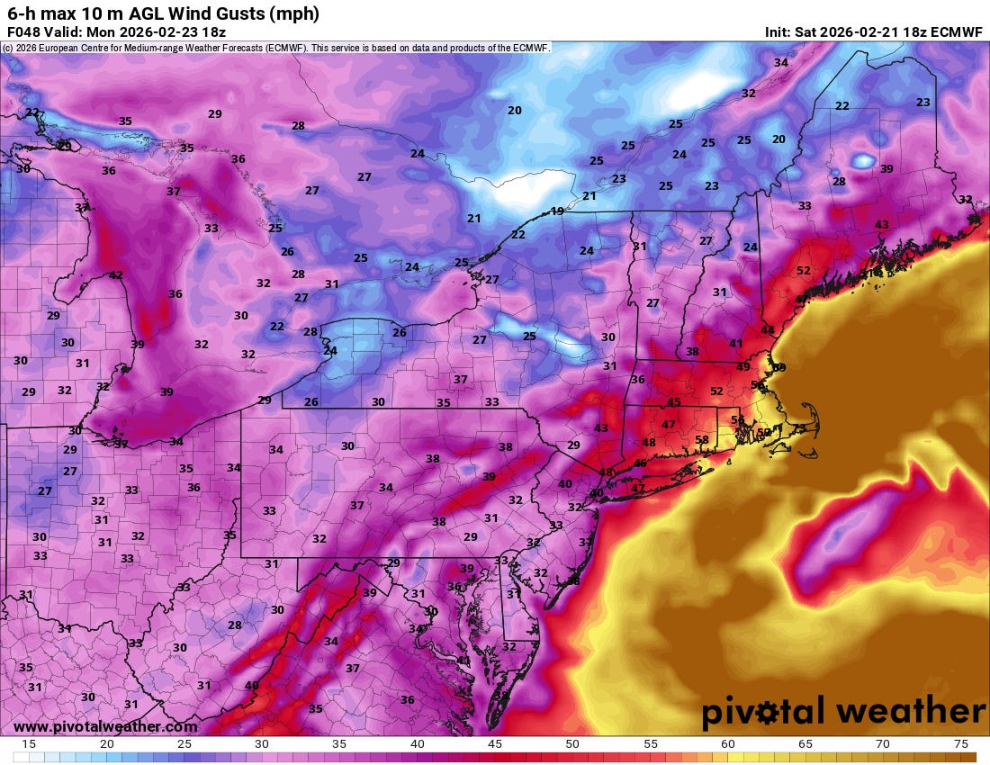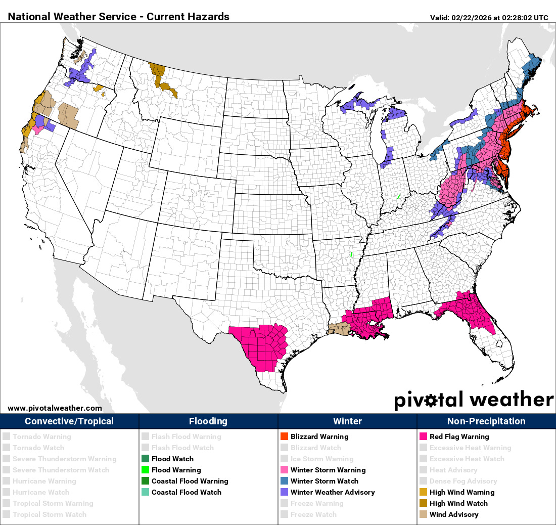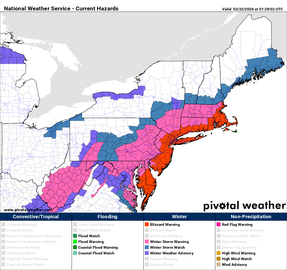 While the overall model solution for this system has not trended fully to some of the absolutely worst case GFS and ensemble scenarios, it has trended closer to the coast over the last 48 hours as can be seen in the most recent afternoon run of the European model. As a result, the main precipitation shield will now affect areas along and a bit inland from the coast, resulting in very heavy snowfall driven by strong winds — and blizzard warnings have been issued accordingly as can be seen in the NWS hazards map above.