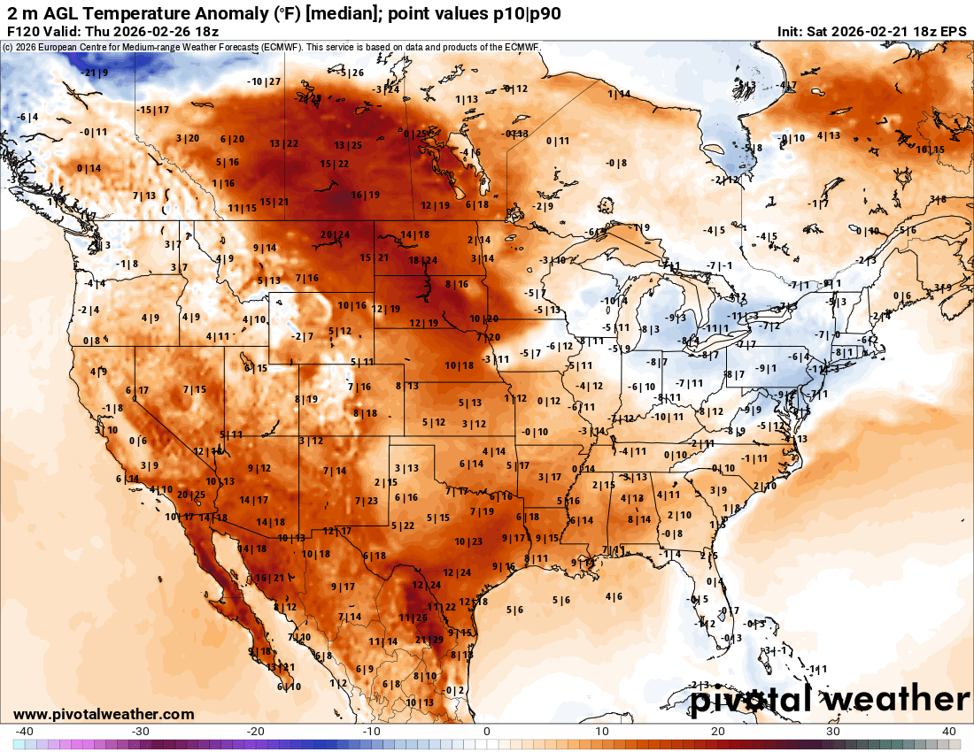 Outside of the shot of Arctic air in the wake of the upcoming blizzard, much of the country will see unseasonable warmth again this week (European ensemble forecast temperature anomalies for Thursday morning shown above).
