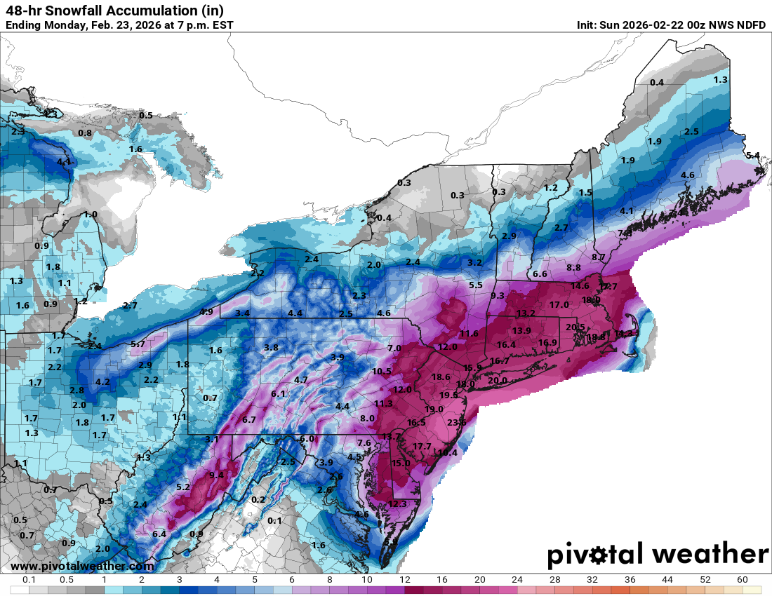 This map shows the official NWS forecast snowfall through the day Monday, which appears to be on the high end of the model snowfall forecasts and (to me, anyway) a bit overdone in the heaviest snowfall areas. Regardless of exact amounts, though, snowfall amounts of a foot or more should be widespread from the Delmarva northeast through New Jersey and the New York City metro area and into southern New England including Boston.