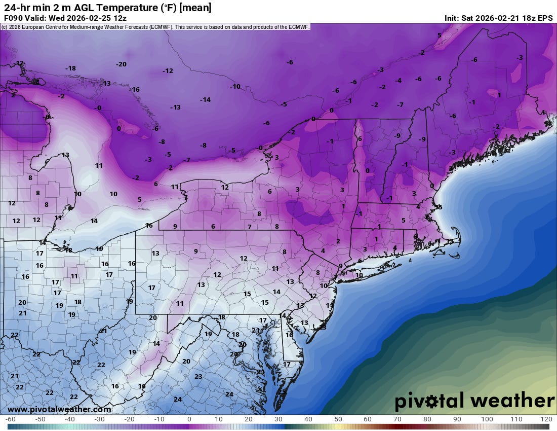 Arctic air will surge into the region behind the low pressure system, with Wednesday morning looking the coldes (forecast lows from the European ensemble model above).