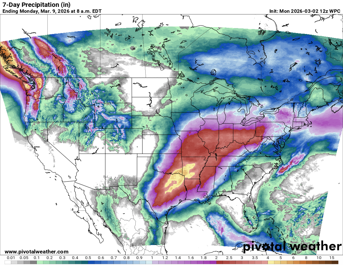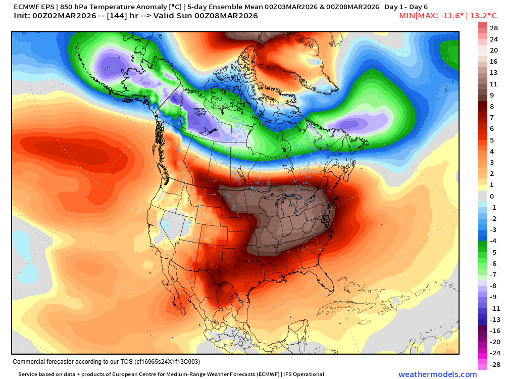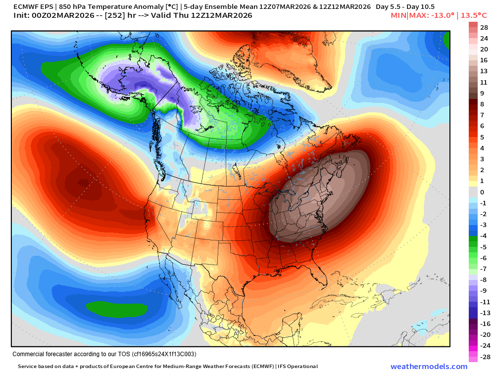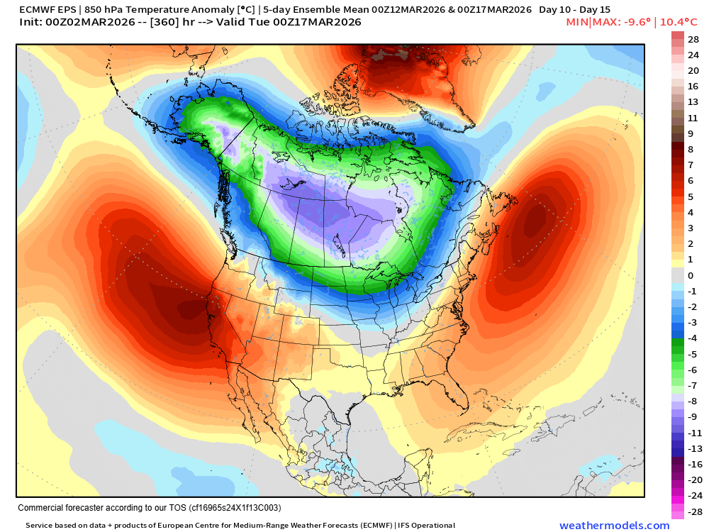 However, as I mentioned yesterday, by mid-March there continues to be signs in the models of an unusually cold airmass building over Canada that starts to seep south and southeast — so we may not quite be done with winter yet. Obviously, though, as we get later into March, normal temperatures are on the rise and truly bitterly cold air becomes much more difficult to get south into the US.