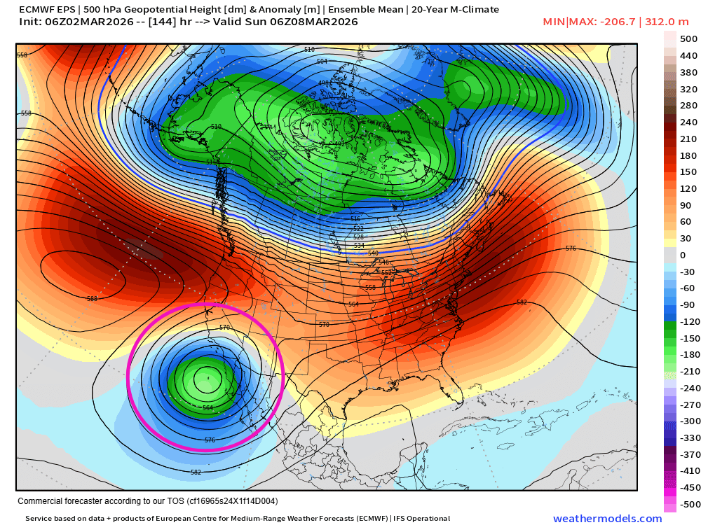 This week will see this record warmth expand and gradually shift east as the advertised change in the pattern to an upper level trough along the longitude of the Rockies with an anomalously strong ridge of high pressure downstream over the East.