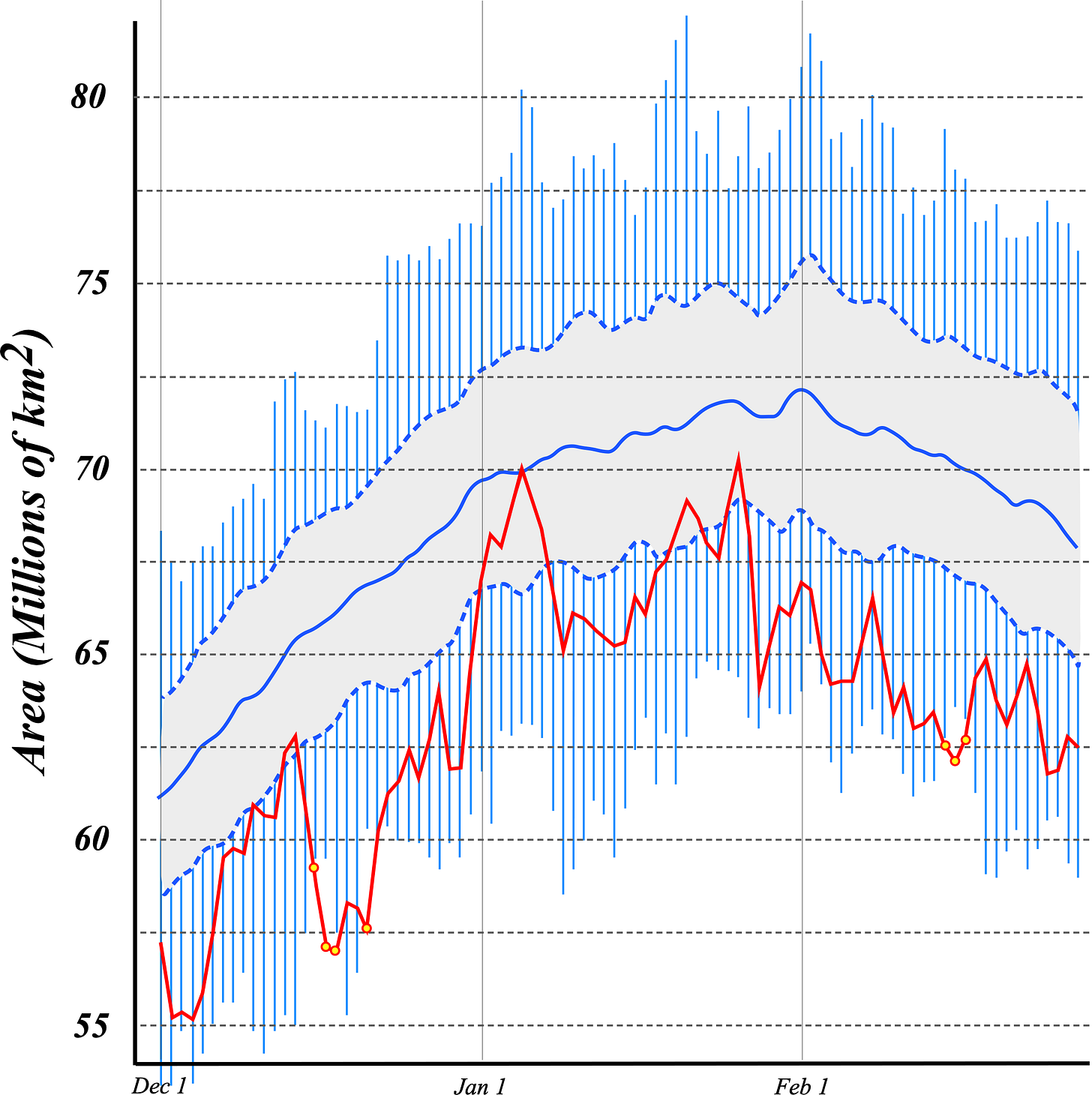 Jon has done groundbreaking work over the years on the structure of winter extratropical cyclones, and one of his ongoing projects as part of his research has been tracking the size of the winter “cold pool.” Meteorologists have long used the 850 millibar (mb) level (about 5,000 ft AGL) as the level in upper level balloon data to analyze the thermal qualities of low level air masses. What Jon does with his tracking is to use the 850 mb temperature analysis from the US Global Forecast System (GFS) model to compute at 6 hour intervals the area of the Northern Hemisphere where the 850 mb temperature is at least -5C or colder, which he defines as the hemispheric “cold pool.” By monitoring this feature, we are not tracking temperatures at given localized points on the surface but rather are able to examine, for lack of a better phrase, the total volume of cold air that exists across the hemisphere.