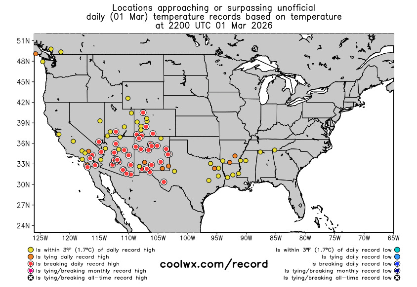 Speaking of warmth, Sunday was yet another day of record warmth across the southwest quarter of the country, with numerous daily records set.