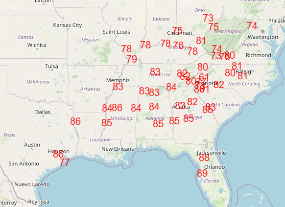 By late in the week, record high temperatures are forecast to be widespread across the southeastern quarter of the nation (forecast record highs for Friday shown above).