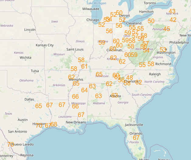 By late in the week, record high temperatures are forecast to be widespread across the southeastern quarter of the nation (forecast record highs for Friday shown above).