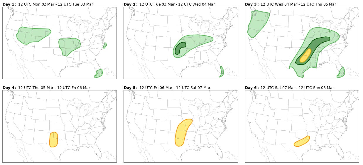 This pattern is also generally favorable for severe thunderstorms, and the Storm Prediction Center has risks outlined the next several days as the various atmospheric disturbances move through the south-central US (green=marginal 1/5 risk; yellow=slight 2/5 risk). As of now, though, there does not seem to be much support for any day with a particularly higher end severe weather threat.