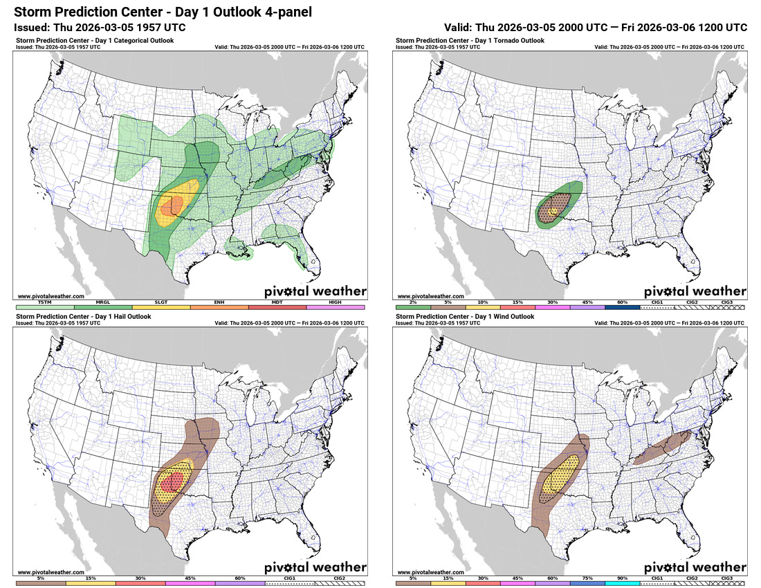 Once again, I have spent most of this post talking about federal science news, but given the severe weather risk the next couple of days, I definitely want to spend a few minutes talking about that. For this afternoon and evening, scattered supercell severe thunderstorms are expected to evolve across parts of the Texas Panhandle and western Oklahoma as an upper level disturbance lifts northeast across the region. The NWS Storm Prediction Center (SPC) has an enhanced (level 3 of 5) risk of severe weather for this setup, with very large hail being the primary risk. A few tornadoes are also possible, and given forecast levels of wind shear, a strong tornado could occur. The tornado outlook in the upper right hand corner has the new CIG1 (conditional intensity group) encompassing the 5 and 10 percent tornado probabilities areas (for more on the SPC CIG product, click here.) SPC noted in a recent discussion that a tornado watch will likely be issued soon for parts of the Texas Panhandle and western Oklahoma.