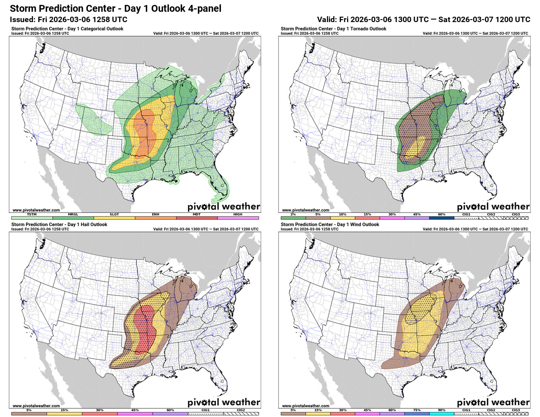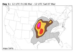 Some of the AI probabilistic guidance (NCAR “FengWu” based on European ensemble shown above) are hinting at two maxima in severe storm risk today. One where the main atmospheric disturbance and mid level maximum of winds will be moving through in the mid-Missouri Valley region, and another farther south where a separate area of storm development should occur in a region of more unstable air. Morning high resolution models suggest that the initial development in both of these areas will be supercell severe storms. However, the northern area should see rapid evolution to a line of severe storms that will move east and northeast across the region with a continued severe risk. The storms may remain more isolated for a longer time in the area farther south, but even there should evolve more into clusters and lines of storms as they move east across eastern Oklahoma and into western Arkansas.