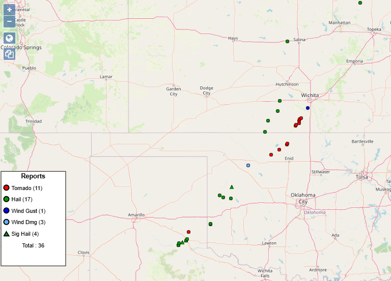 As anticipated, several supercell severe thunderstorms impacted the region from the Texas Panhandle to south central Kansas late Thursday into the overnight hours. The storms were responsible for more than 30 reports of severe weather, including several tornadoes and hail up to 2.25” in diameter.