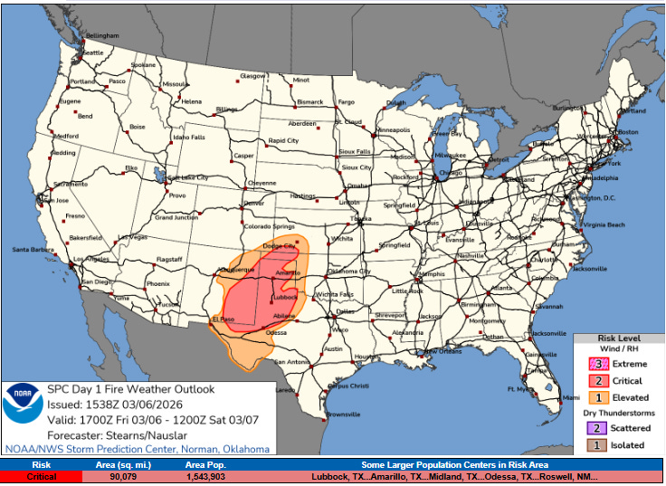 Along with the severe weather risk today, there is also a critical (level 2 of 3) risk of wildfire danger across the Plains to the west of the severe weather risk area. This area is suffering from a serious lack of rainfall over the last several months, and with dry and windy conditions developing today to the west of a dryline, concern exists for rapidly spreading wildfires.