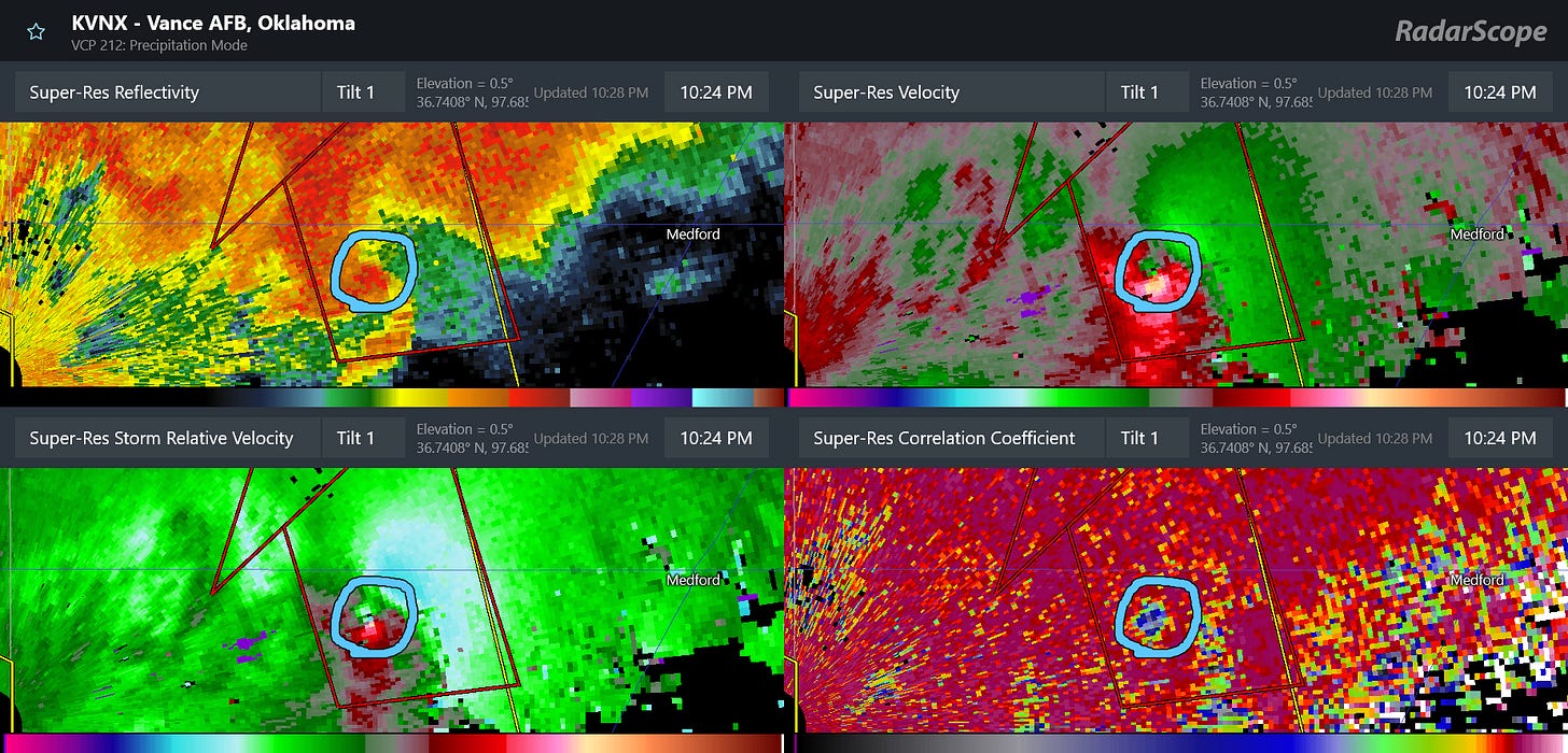 A series of storms in northwest and north central Oklahoma northwest of Enid produced a few tornadoes which looked potentially strong (EF2+) given radar data and chaser reports. The storms were relatively close to the Vance AFB radar site, which provided an excellent view of the storms This 4-panel display is classic example of a likely strong supercell tornado, with a very intense, tight circulation in velocity data (upper right and lower left panels). It also shows clear indications of lofted debris in the maximum of reflectivity in the “debris ball” (upper left) and low values of correlation coefficient dual-polarization data (lower right) due to the varying shapes and sizes of the detected debris. While these storms impacted a rather rural area, there have been reports of damaged homes and buildings, and unfortunately The Weather Channel is reporting that two people died when their car was struck by a tornado near Fairview, OK.