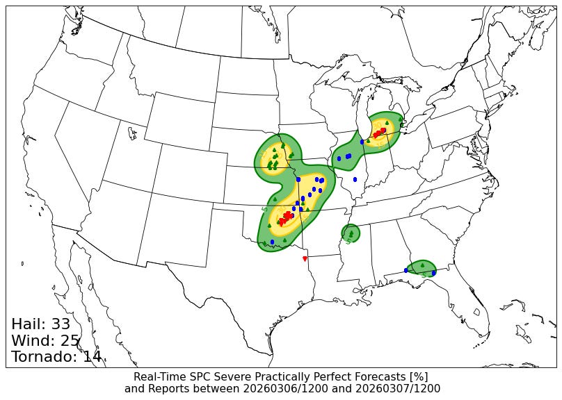 It is interesting to me that even though it obviously was a bit off with exact location and coverage, the NCAR FengWu AI probabilistic forecast that I included in my post yesterday actually did a decent job in identifying these maxima in severe weather coverage — even showing a small 15% max in the vicinity of southwest lower Michigan.