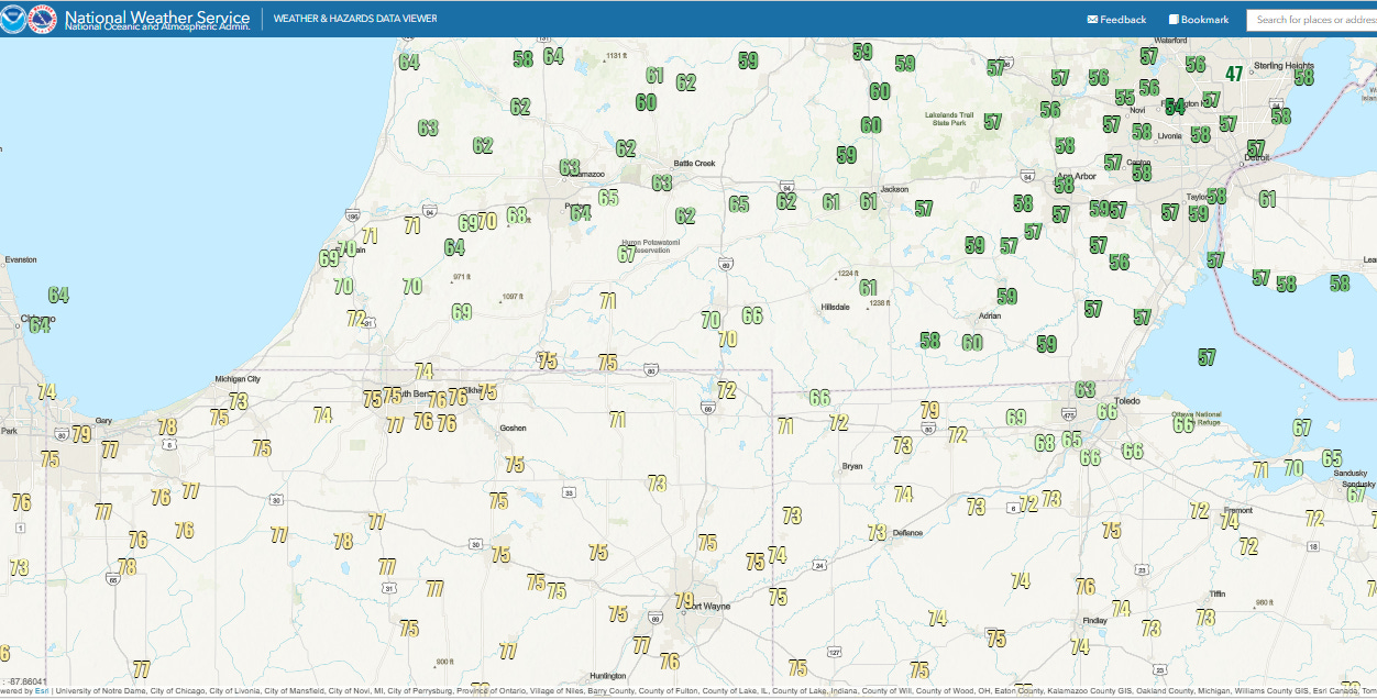 In my post last night, I discussed how these tornadoes developed within an area of low tornado probabilities — but along a warm front where wind shear was enhanced. This observed high temperature map from yesterday shows clearly where the warm front hung up across southern Lower Michigan, with temperatures in the mid and upper 70s to the south and upper 50s to the north.