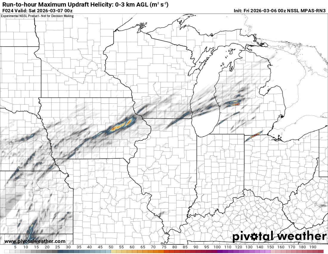 The main reason for the low tornado probabilities was not any question about the environment being favorable for severe weather and tornadoes, but rather whether surface-based storms — i.e., storms with inflow connected to the surface — would develop to be able to take advantage of the favorable environment. Most of the high resolution models showed limited development of such storms — though when a model did show development like this NSSL experimental model run, they showed strongly rotating supercell storms.
