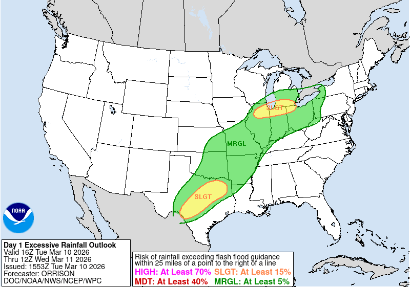 Intense rainfall rates with these storms could also cause some localized flash flooding, with more focused risks of flash flooding along the warm front in the Lower Great Lakes and over parts of eastern Texas.