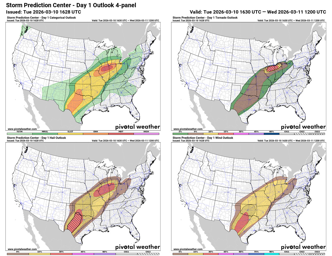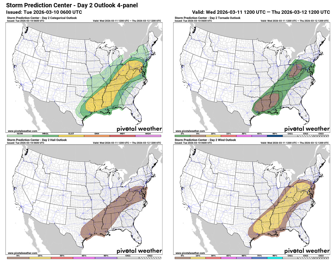 Additional severe weather is expected Wednesday and Wednesday night as the front slides east. As of now, SPC has a large slight (level 2 of 5) risk along the front. Some of the AI guidance is more aggressive with the severe weather risk tomorrow — but as I have mentioned in earlier posts, this severe weather threat actually looks more like a risk later in the season that will be modulated by how the atmosphere evolves at smaller scales due to thunderstorm evolution. This means that the areas most at risk for higher end and focused areas of severe weather will be rather dependent upon what happens with thunderstorm activity today. Hence, identifying those areas will be more challenging and will be waiting for later updates as the day 1 SPC outlooks come out.