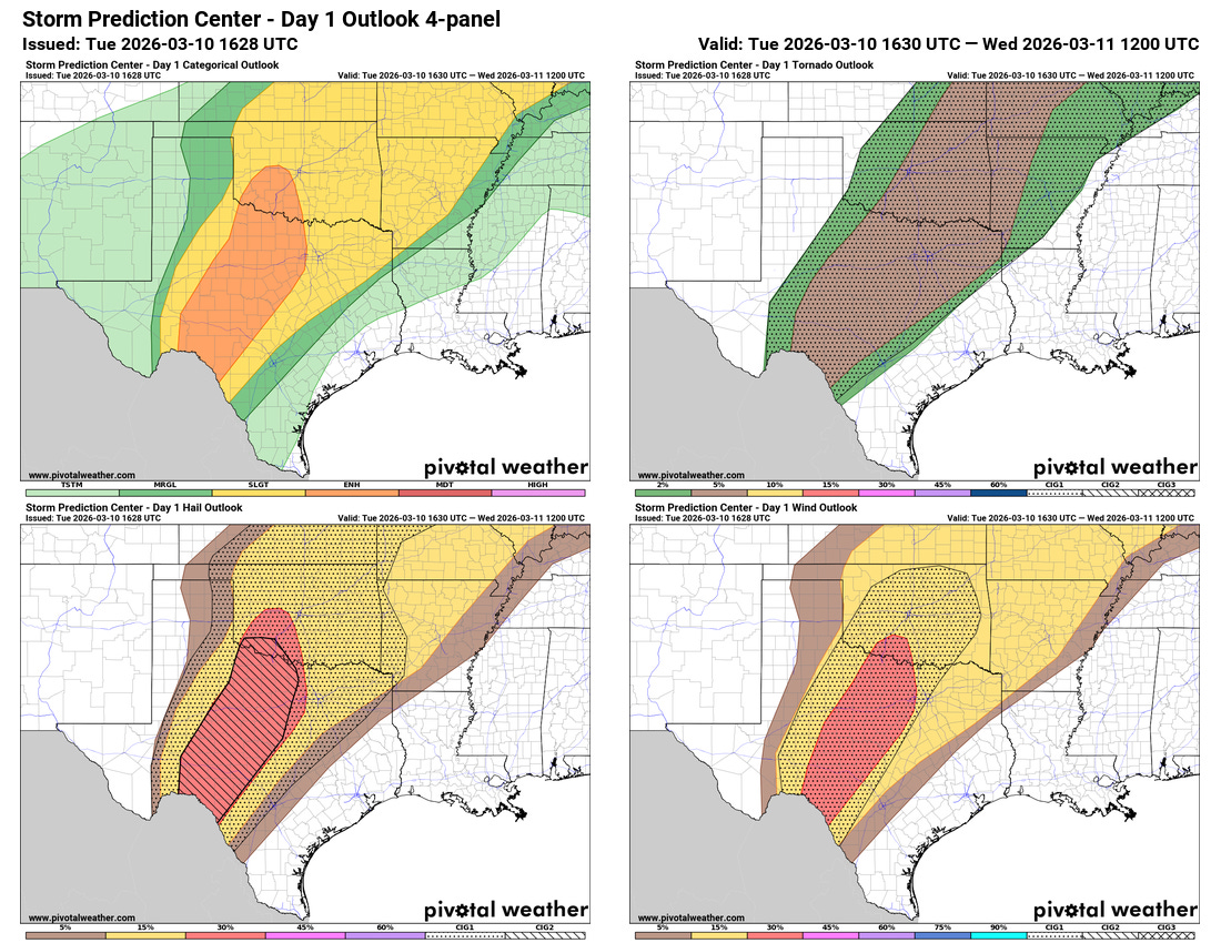 Turning our attention to the weather, unfortunately the severe weather risk has continued to trend more ominous for today, particularly in the northern of our two areas of concerns where the NWS Storm Prediction Center (SPC) now has a moderate (level 4 of 5) risk in place.