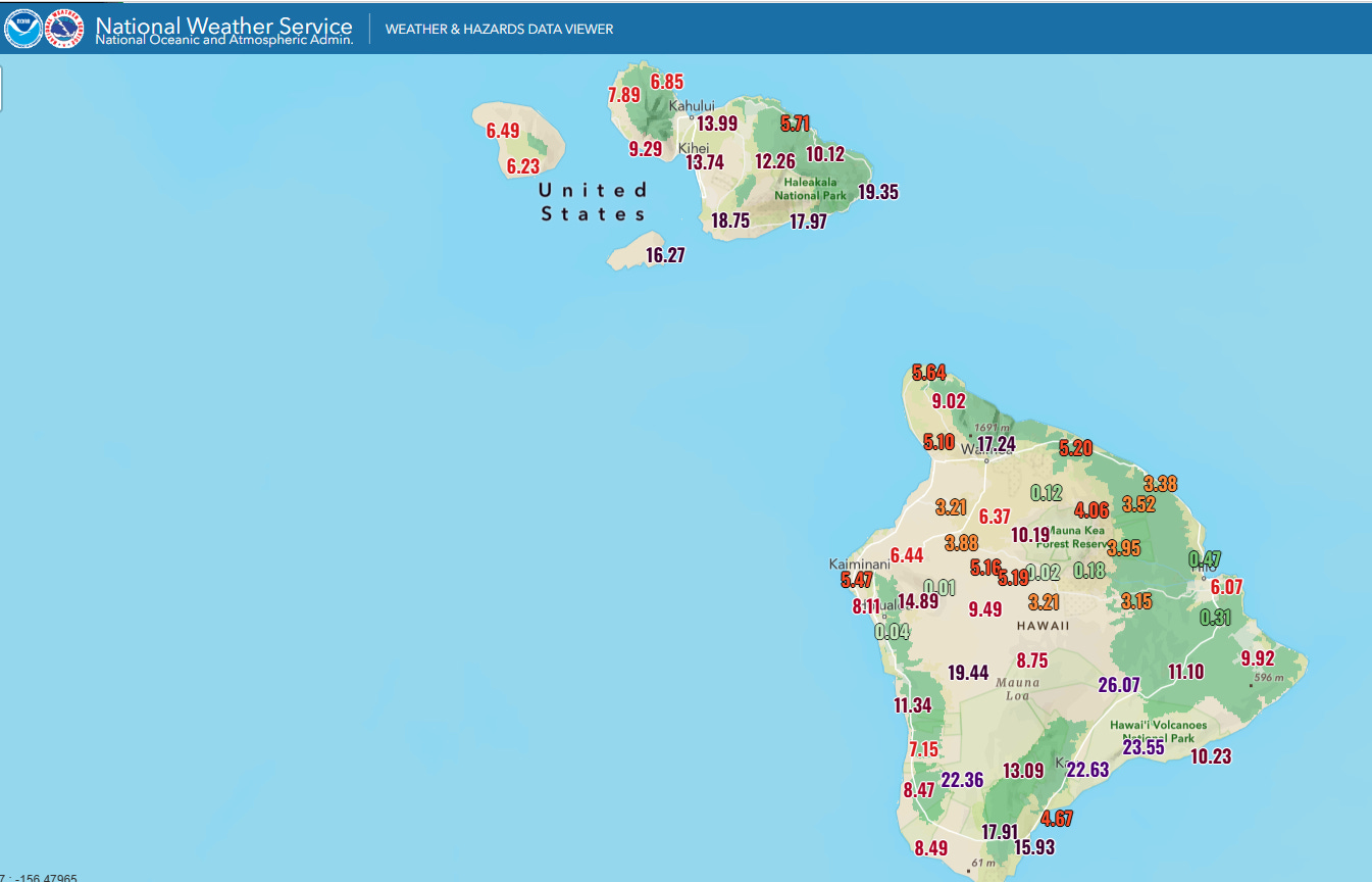 Hawai’i is finally starting to see conditions improve after days of high winds, severe storms, massive rainfall and flash flooding. Maui and Hawai’i had the most impactful rainfall the last few days, and these 3-day rainfall totals shown above do not encompass the entire event, as heavy rain fell on the prior couple of days during which the western islands including Oahu had significant impacts. This story from Hawaii News Now summarizes the 5-day rainfall totals, including the max of 44.37” on Maui.