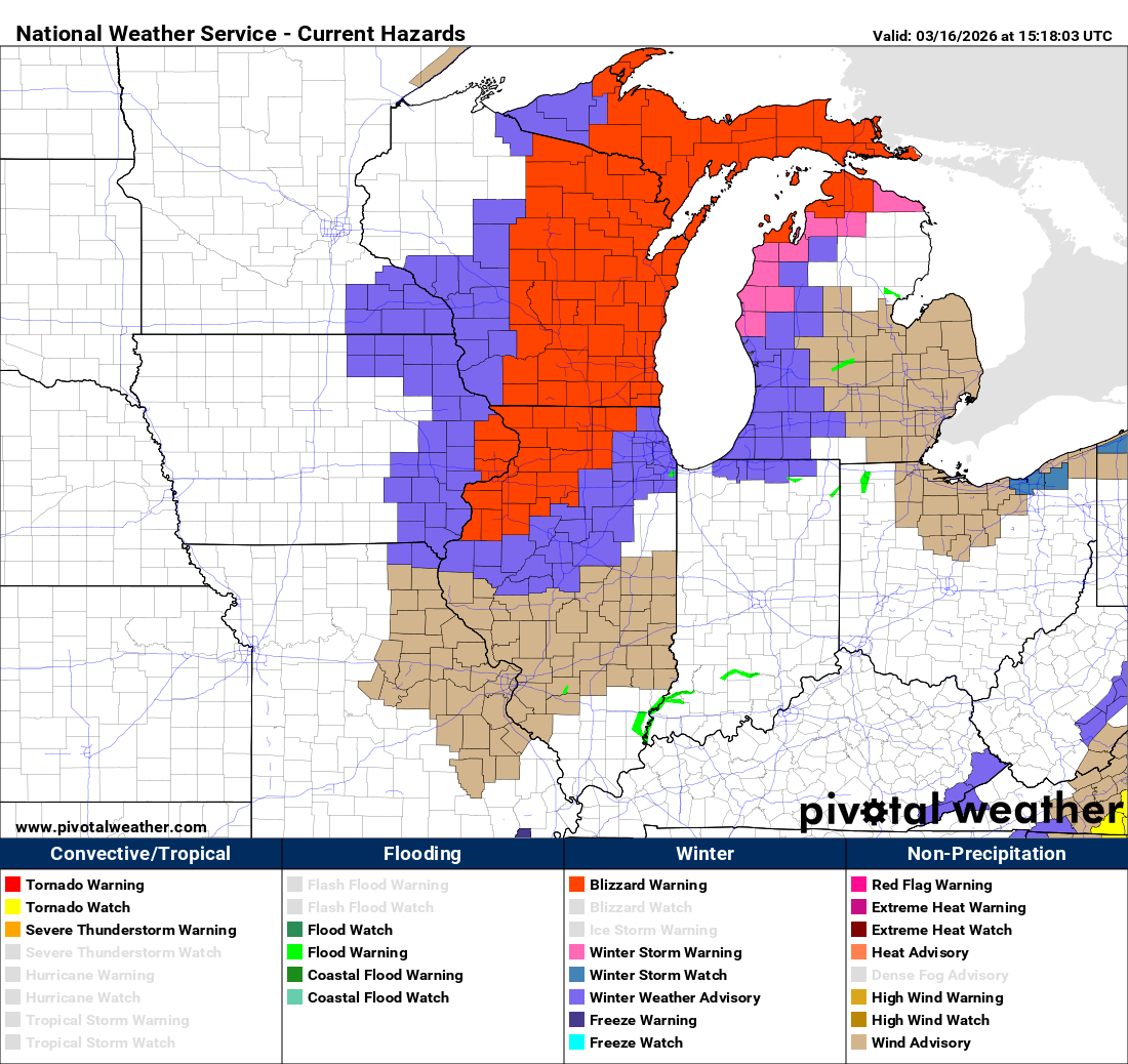 Moderate to heavy snow will continue across the region today, and blizzard warnings remain in effect from northwest Illinois and extreme eastern Iowa across northern Michigan. Strong winds will also continue in surrounding areas due to the intense low pressure center slowly moving east-northeast into Ontario.