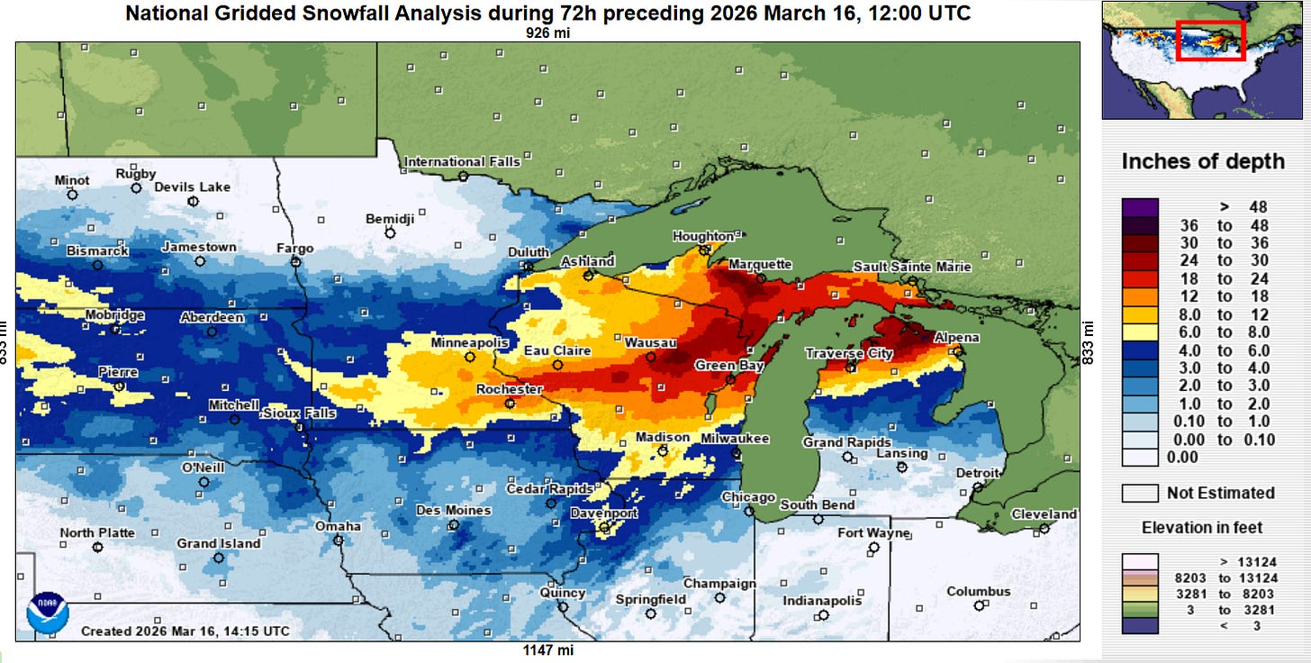 So now let’s turn to the reason why everyone (myself included) is here – the weather. Heavy snow continued overnight across parts of the upper Midwest with the intense low pressure system over the lower Great Lakes. Snowfall totals have now reached 30” at several locations across northeast Wisconsin and parts of northern Michigan.