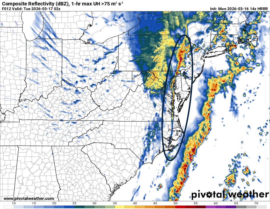 Eventually, a strong forced line of showers and storms should evolve right along the cold front this evening (forecast position for 9 pm ET tonight from latest High Resolution Rapid Refresh model above). This line seems likely to produce strong winds and possibly a few tornadoes as it sweeps across the Mid-Atlantic
