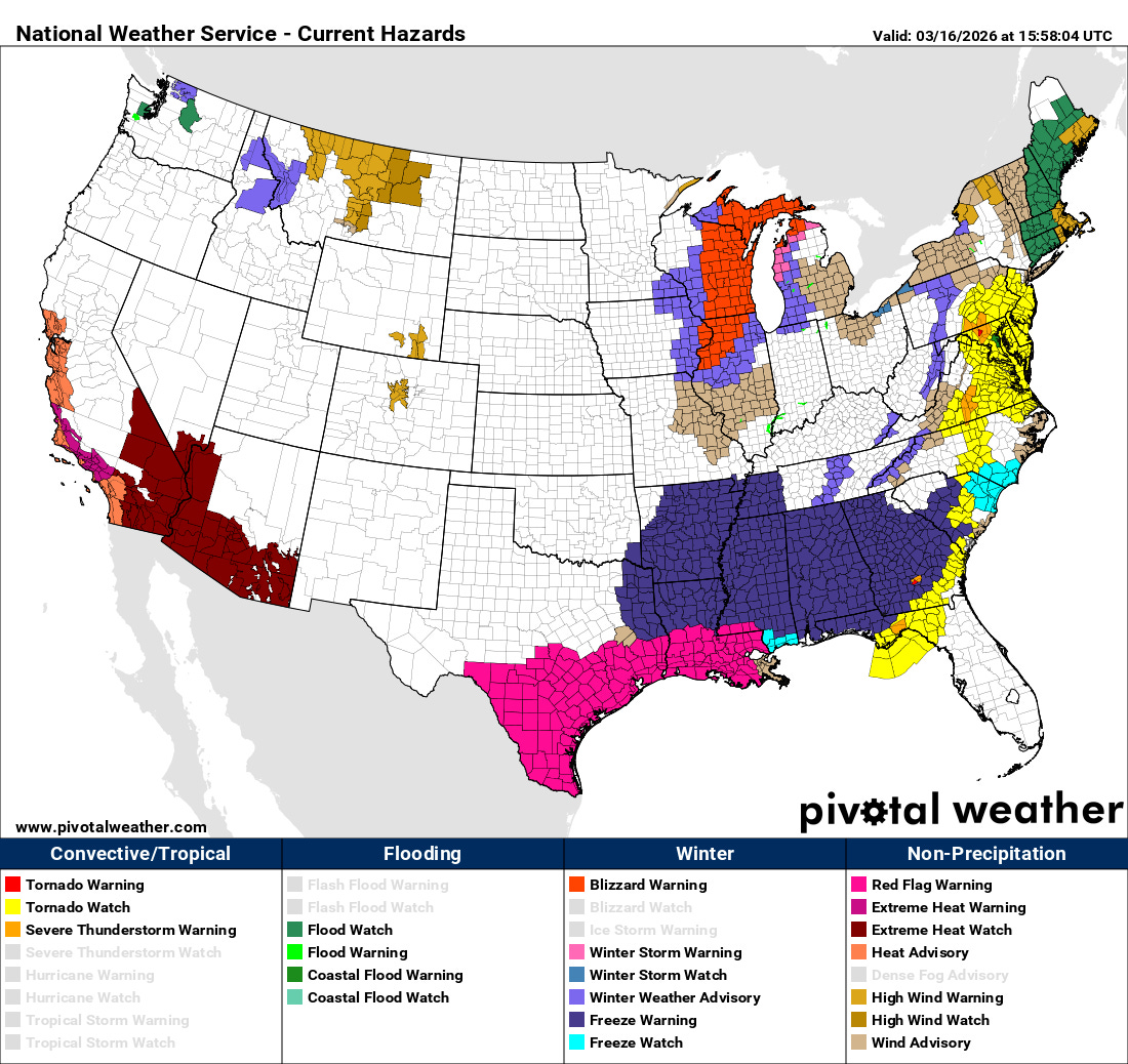 You can see in the NWS advisory map above that numerous extreme heat watches and warnings are in effect for the Southwest. This is part of an ongoing heatwave that will become a historic and unprecedented March heat event as this week goes on. I will have much more to say about this event in coming days, but in the meantime I want to encourage you to read this excellent article (gift link) by San Francisco Chronicle meteorologist Anthony Edwards which provides tremendous background and context on this incredible event we will witness this week.