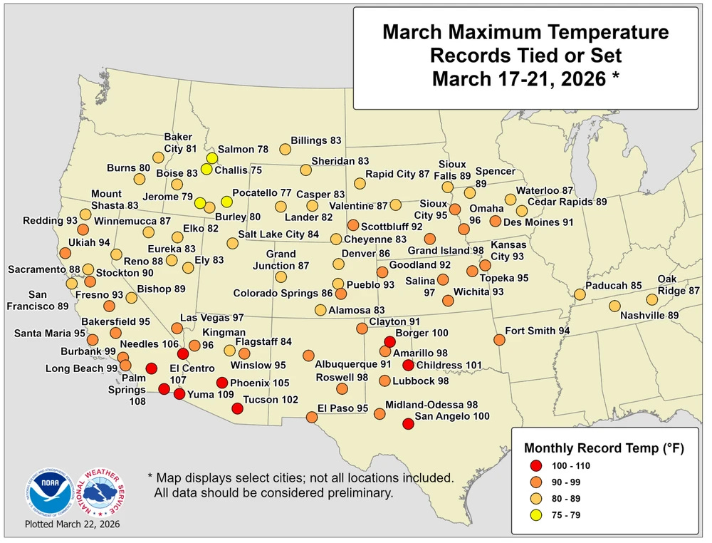 This map from the NWS shows a selection of the climate sites around the country that have set monthly records for March so far during this heatwave. As a reminder, many locations in the West have reached high temperatures above their original monthly heat record on several days, and in some cases have actually set new records on multiple days. As an example, my colleague Matt Lanza pointed out that El Paso set new monthly record high temperatures on Friday (94F), Saturday (95F), and Sunday (96F).