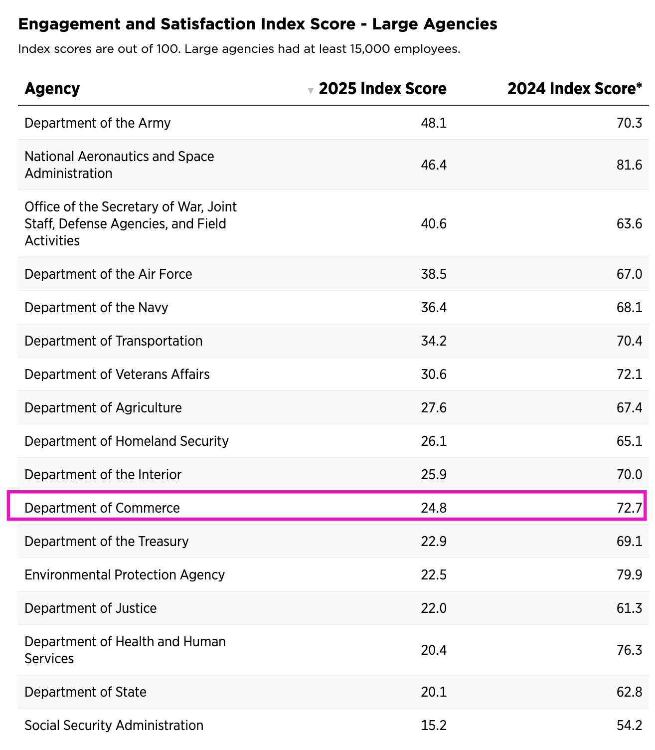 I would say that the drop in the employee index score of Commerce from 72.7 to 24.8 is unbelievable to me — but really, what I mean is that prior to March 2025 it would have been unbelievable to me. Given the stories I hear on an almost daily basis from colleagues still in NOAA about the state of affairs and the trials of being a federal employee, and how the morale of the employees has cratered in the last 12 months, ultimately I am not that surprised.