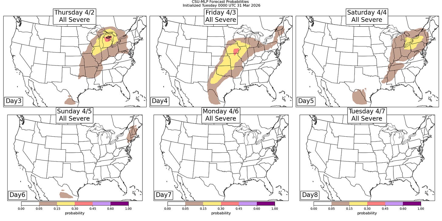 As additional upper level disturbances move east and interact with Gulf moisture and instability streaming north, risks of severe storms will continue for the remainder of the week from the Southern Plains northeast into the Great Lakes region. The forecast from the Colorado State University-Machine Learning Probabilities (CSU-MLP) seems to have a reasonable initial forecast for this longer forecast range — we will be able to better refine these risk areas as we get later into the week.