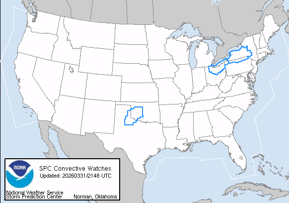 Severe thunderstorm watches are in effect through the evening for the eastern Great Lakes region for these severe storms. Additionally, a new severe thunderstorm watch was recently issued for parts of western Oklahoma and northern Texas, where scattered severe storms producing hail up to golf ball size and damaging wind gusts are expected.
