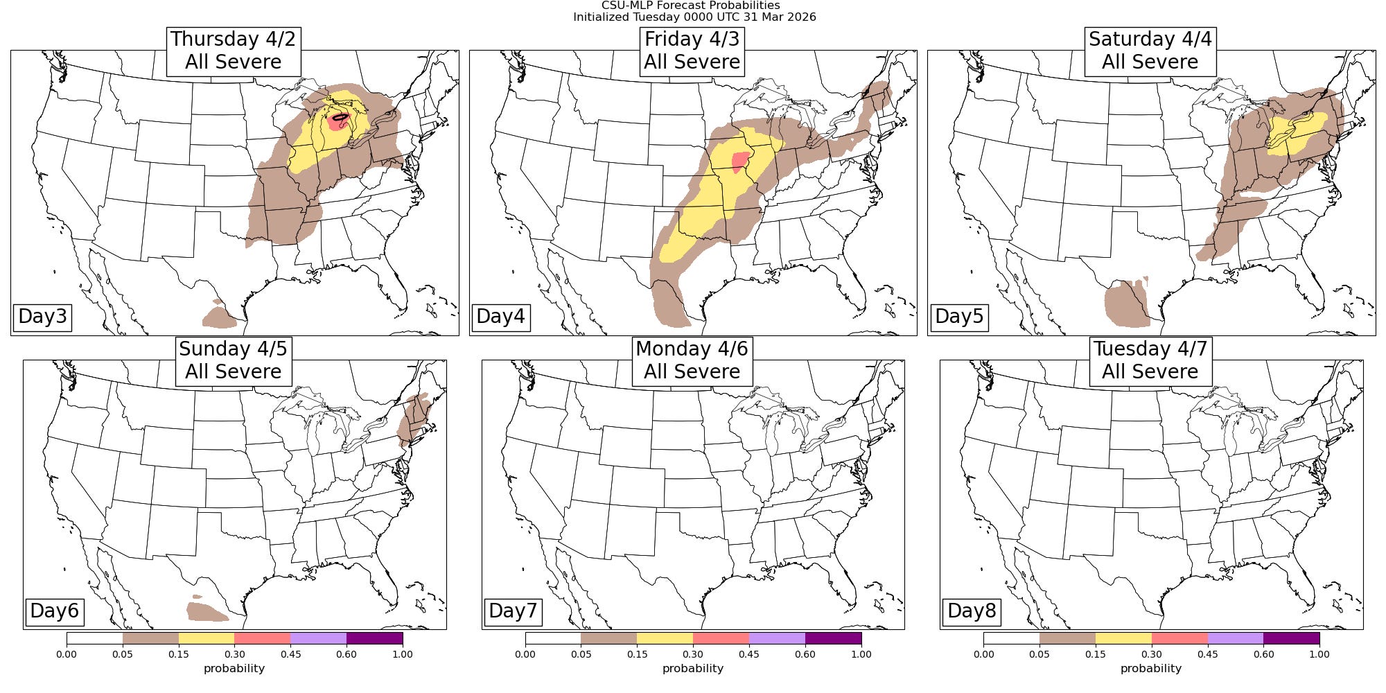 As additional upper level disturbances move east and interact with Gulf moisture and instability streaming north, risks of severe storms will continue for the remainder of the week from the Southern Plains northeast into the Great Lakes region. The forecast from the Colorado State University-Machine Learning Probabilities (CSU-MLP) seems to have a reasonable initial forecast for this longer forecast range — we will be able to better refine these risk areas as we get later into the week.