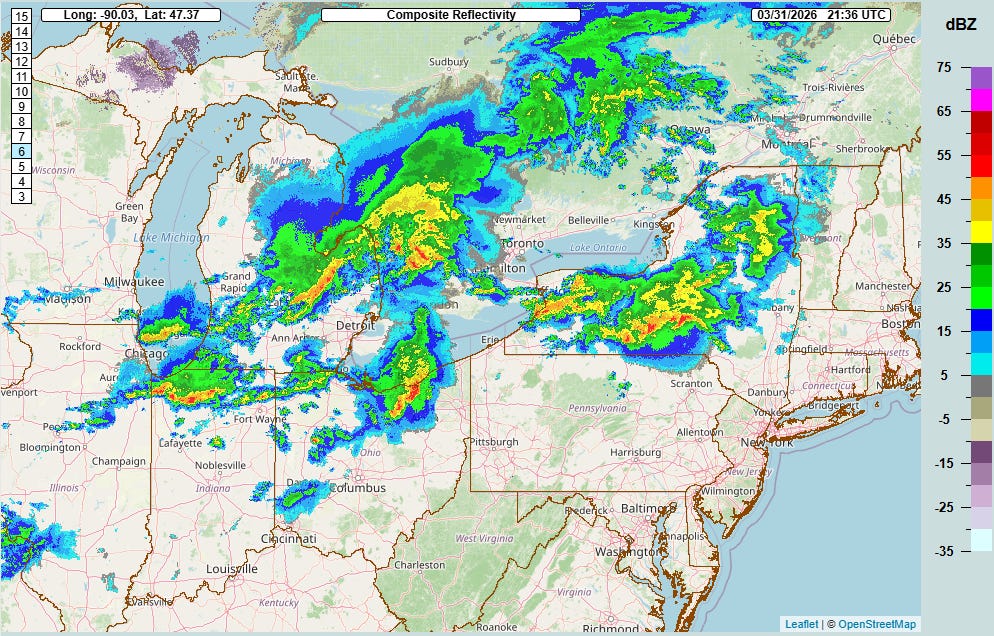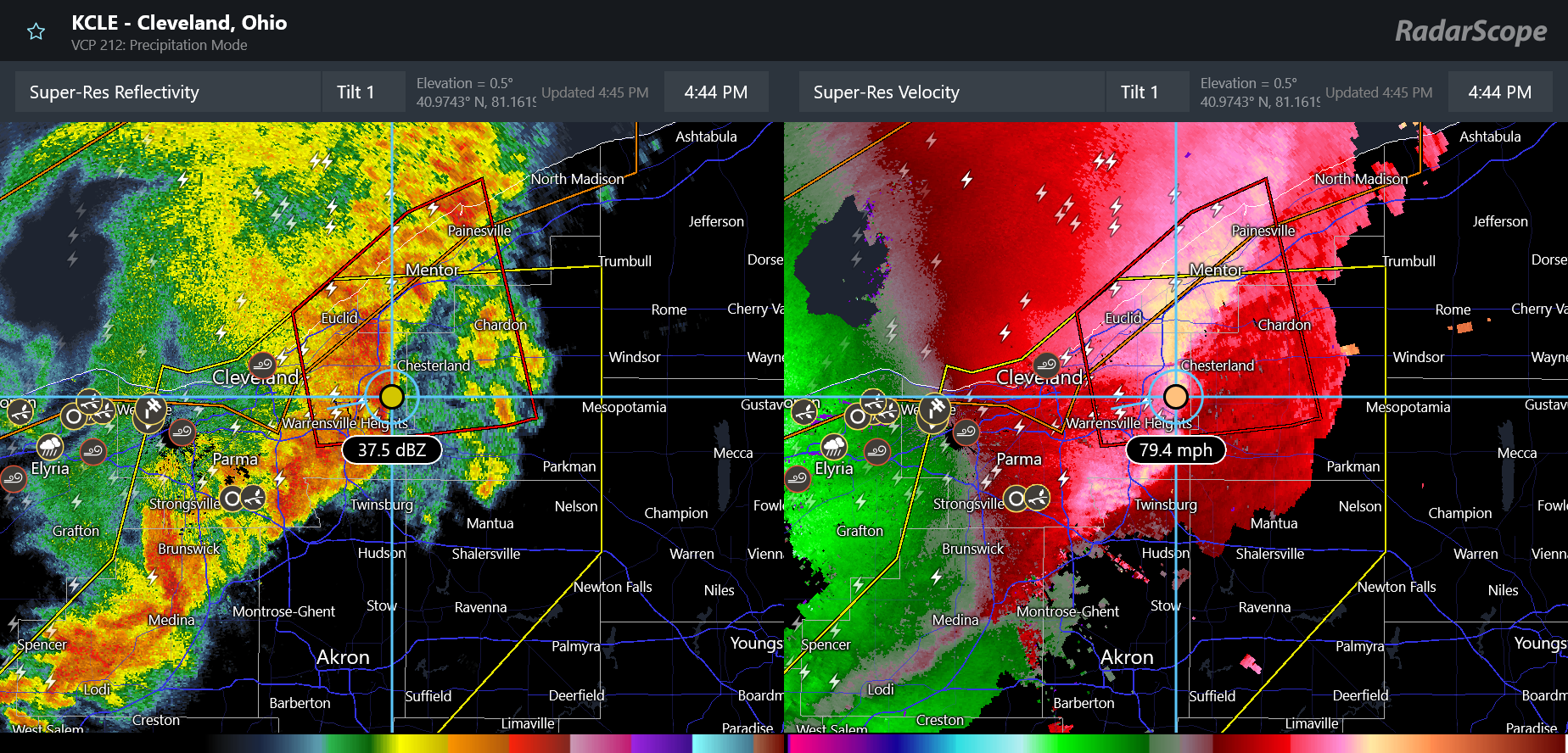 The most intense thunderstorm activity is currently the line of severe storms moving through the Greater Cleveland area. The band of storms has been producing damaging winds along the south shore of Lake Erie, with the automated observing equipment at both Cleveland Hopkins and Burke Lakefront airports reporting 71 mph wind gusts in the last 30 minutes. As you can see above, radar is showing winds of up to 80 mph just above ground level moving through the eastern suburbs of the Cleveland metro area just before 6 pm ET.