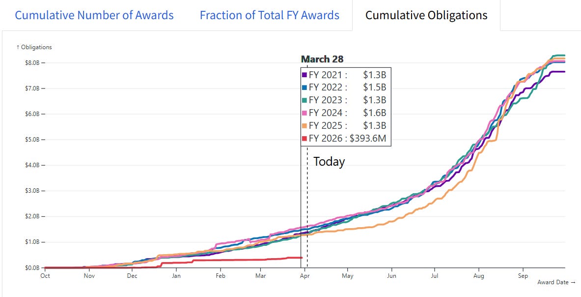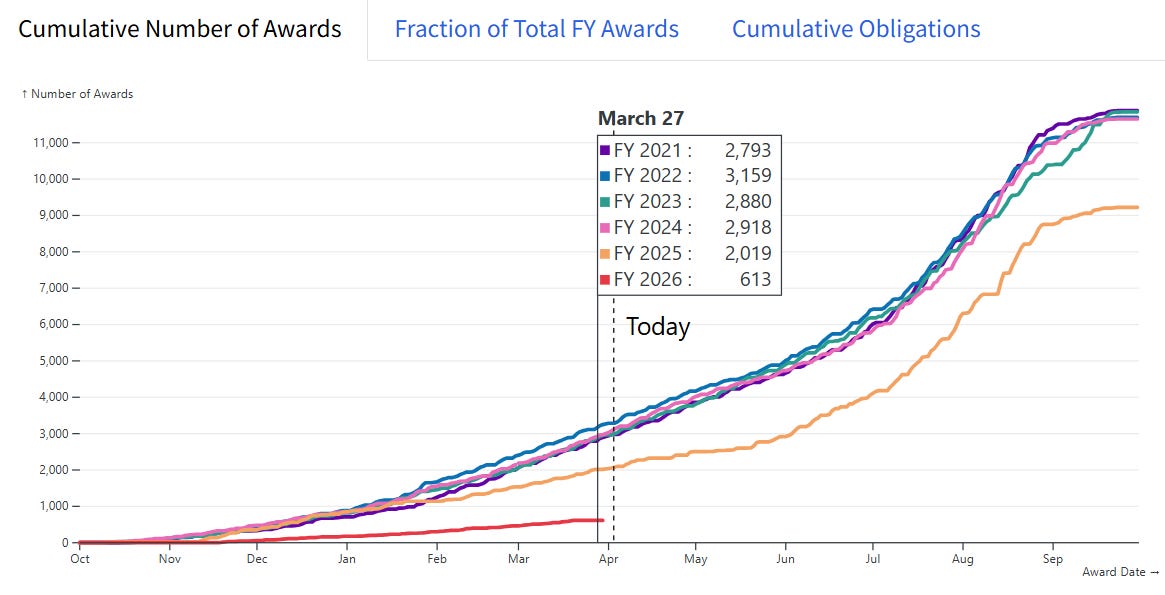 This issue with appropriated funding not being allocated by OMB — or potentially not being awarded by the agency — also can be seen with the National Science Foundation (NSF). This graphic from the website GrantWitness.us based on publicly available data shows the number of NSF grant awards that have been made in each fiscal year back to 2021 — you can see that 2026 has seen a fraction of even the number of awards made in 2025, which was in its own right much below previous years.