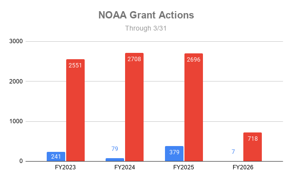 As I discussed in a post last July, Vought has made many public statements trying to establish executive power over spending, saying Congressional appropriations are “a ceiling, it is not a floor…you don’t have to spend every penny of that.” My post yesterday showed examples of where OMB is apparently executing on that strategy, with NSF grant actions running well behind previous years. I have utilized the data available at USASpending.gov to take a similar look at NOAA grant actions, and found that new NOAA grants so far in FY2026 through the end of March total 7, in comparison to 379 through the same time last year and a 3-year average of 233. Looking at total grant actions — in other words, not just new grants but also renewals, extensions, new financial awards for ongoing grants, etc. — NOAA has executed 718 so far this year, compared to 2696 in FY25 and a 3-year average of 2652.