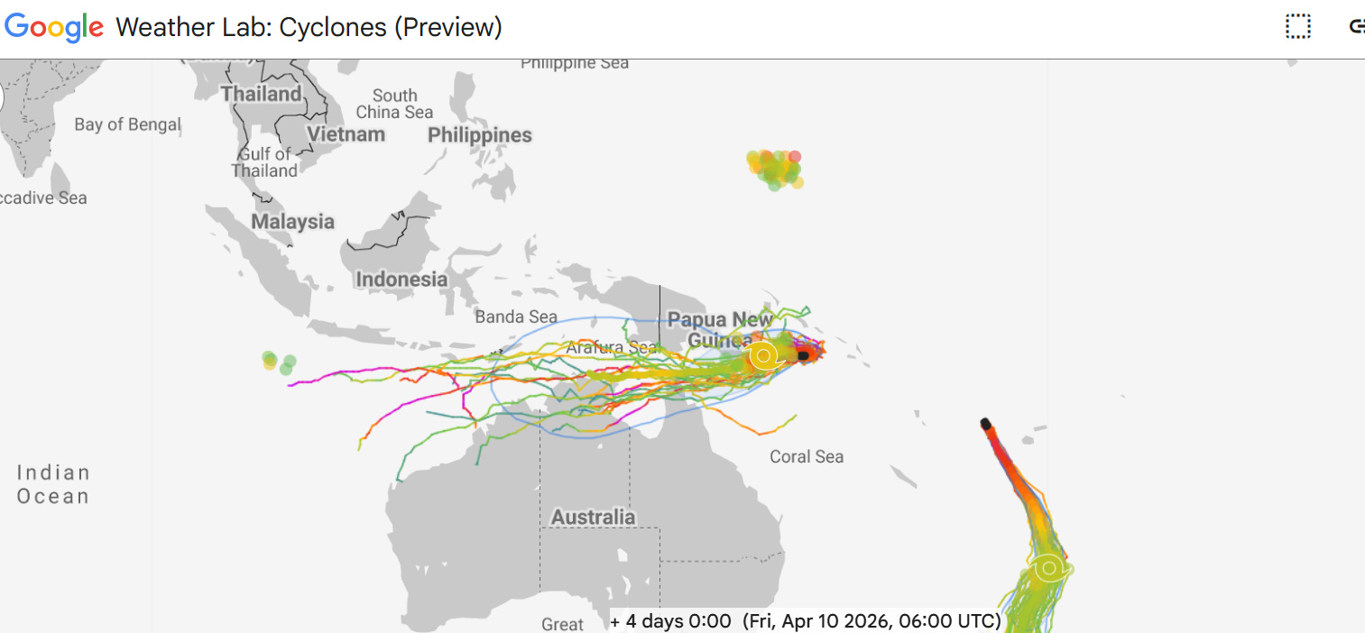 The Google DeepMind (GDM) AI forecast for the next four days — as well as the JTWC forecast — generally shows both Maila and Vaianu intensifying a bit more before starting a slow weakening trend. Maila will meander around before starting a slow west to southwest motion, while Vaianu will begin to move south in the general direction of New Zealand. Vaianu will begin to begin to transition to a post-tropical cyclone in a few days, and could cause significant impacts in New Zealand later this week as a large post-tropical system.