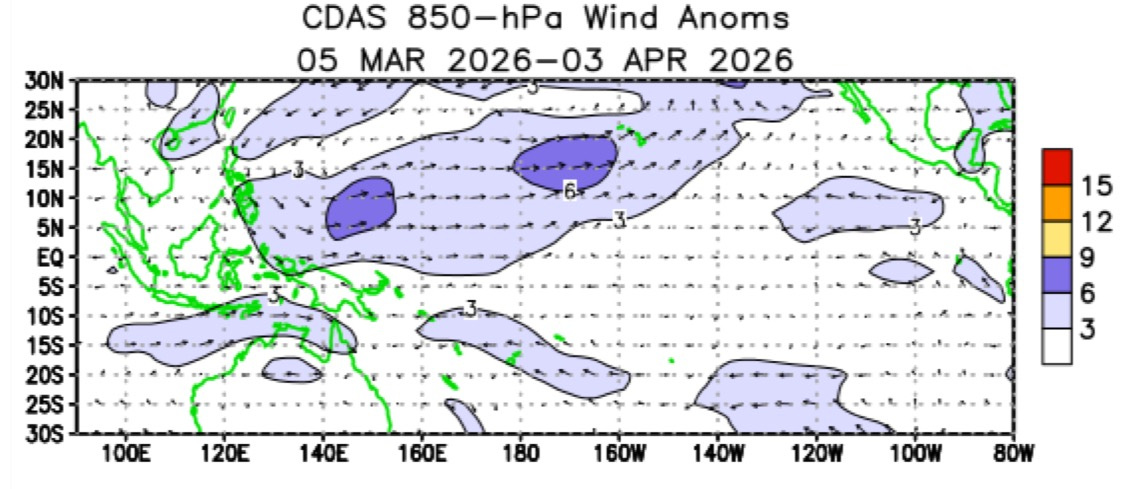 The formation of these tropical cyclones in relatively close proximity on either side of the equator is not a coincidence. It is part of a phenomenon known as a “westerly wind burst” (WWB) in which the normal easterly trade winds become more westerly — you can see in the wind anomaly over the last month how the winds have been anomalously westerly (arrows pointing west to east) in this region, and the formation of these tropical cyclones are further evidence that a WWB is in progress.