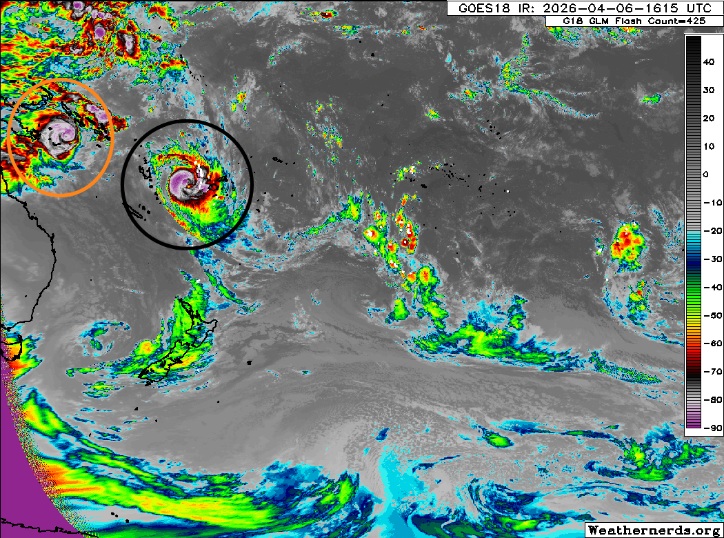 This GOES-18 infrared image (courtesy Weathernerds.org) shows two tropical cyclones to the east of Indonesia and northeast of Australia: Maila (orange circle) and Vaianu (black circle). Both of these cyclones are estimated by the Joint Typhoon Warning Center to be the equivalent of a strong category 2 hurricane on the Saffir-Simpson Hurricane Wind Scale.