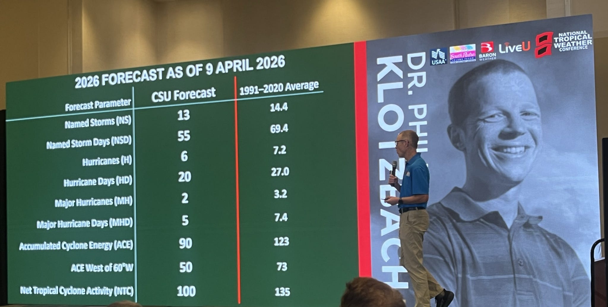 I had the incredible opportunity this morning to get the first major seasonal hurricane outlook for 2026 straight from the horse’s mouth. Dr. Phil Klotzbach, the scientist who took over as the lead for the renowned Colorado State University’s Tropical Cyclone Research and Forecasting Project after the retirement of pioneering scientist Dr. William Gray, gave a presentation at the National Tropical Weather Conference this morning detailing his team’s initial expectations for the 2026 Atlantic hurricane season.